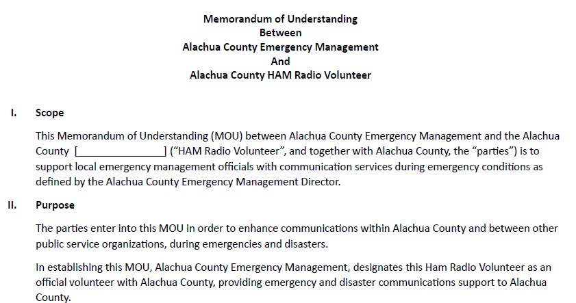 This is the new Memorandum of Understanding that serves to provide legal underpinning and insurance for our service to the county. To remain or to become a new volunteer for the county, you will need to sign this document, and send either to Leland Gallup or to the Emergency Manager. There are some other requirements (training, background check, volunteer applications etc).